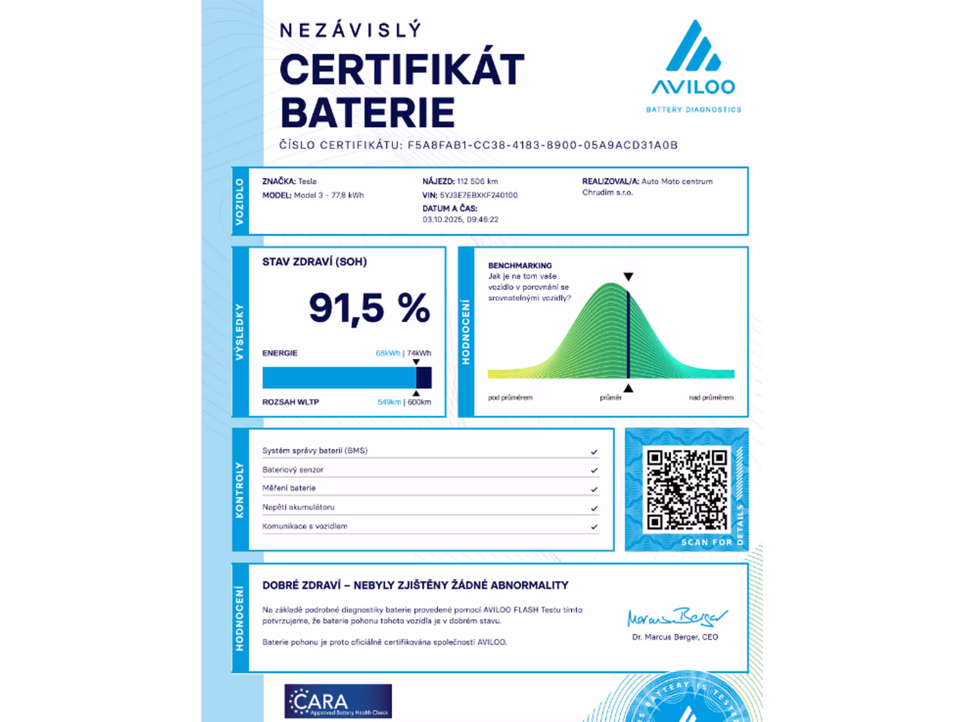 Tesla Model 3 Long Range Dual Motor 350 kW SOH 91,5% (ODPOČET DPH) - cena uvedena vč. DPH, baterie 78.8 kWh, dovoz: EU, VIN: 5YJ3E7EBXKF240100, elektro, do provozu: 28.3.2019, najeto: 112545 km, pohon kol: 4x4, automatická převodovka, STK do: 10/2027, WLTP 560km, klimatizace, procesor INTEL ATOM, klimatizace, panoramatická střecha. Záruka na Akumulátor a hnací ústrojí 8 let nebo po ujetí 192.000 km (podle toho, co nastane dříve).*MOŽNOST VYKOUPENÍ VAŠEHO STARÉHO VOZU PROTIÚČTEM* *MOŽNOST VÝHODNÉHO FINANCOVÁNÍ už bez nulové akontace* Pro nezávaznou kalkulaci nás neváhejte kontaktovat. Nutno vždy volat předem! Prohlídky možné i mimo pracovní dobu tel. 732710796 Mates auto