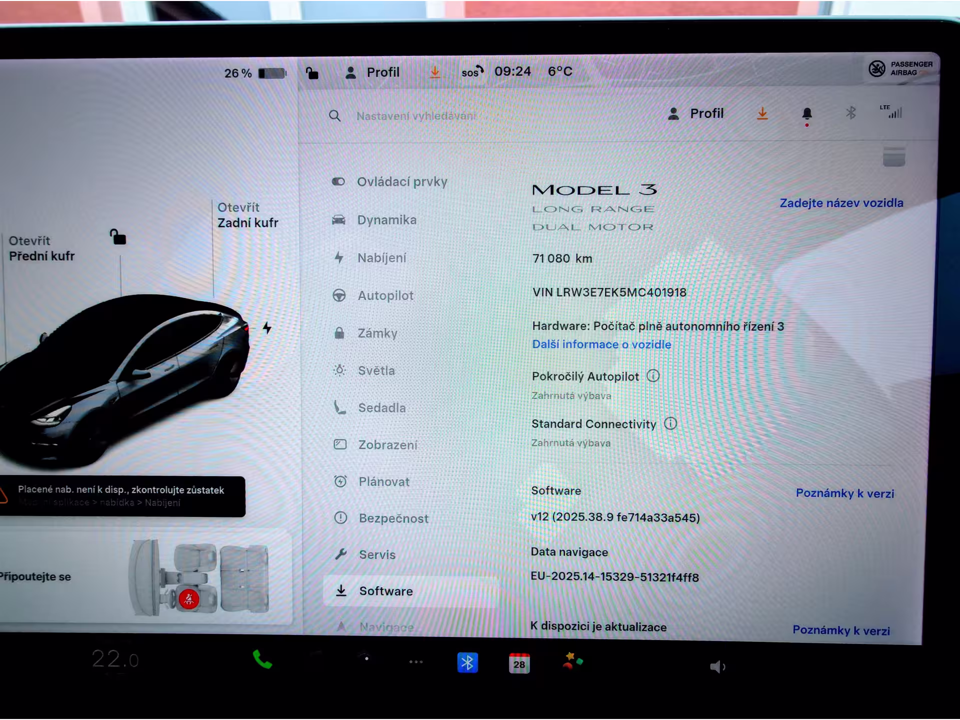 Tesla Model 3 Long Range Dual Motor - EAP 366kW SOH 91,3% (ODPOČET DPH) - cena uvedena vč. DPH, baterie 78,8 kWh - LRW3E7EK5MC401918, dovoz: Německo, elektro, do provozu: 17.11.2021, najeto: 71080 km, pohon kol: 4x4, automatická převodovka, STK do: 2/2028, přední a zadní parkovací senzory, parkovací kamera, přední a zadní vyhřívaná sedadla, vyhřívaný volant, EAP AUTOPILOT ZA 100.000KČ, BOOM BOX, MATRIX SVĚTLOMETY, procesor INTEL ATOM, WLTP 580 km. Záruka na Akumulátor a hnací ústrojí 8 let nebo po ujetí 192000 km (podle toho, co nastane dříve). *MOŽNOST VYKOUPENÍ VAŠEHO STARÉHO VOZU PROTIÚČTEM* *MOŽNOST VÝHODNÉHO FINANCOVÁNÍ už bez nulové akontace* Pro nezávaznou kalkulaci nás neváhejte kontaktovat. Nutno vždy volat předem! Prohlídky možné i mimo pracovní dobu tel. 732710796 Mates auto. Nejedná se o návrh na uzavření smlouvy (nabídku) dle § 1731 zákona č. 89/2012 Sb., občanský zákoník, ale o nezávaznou nabídku.