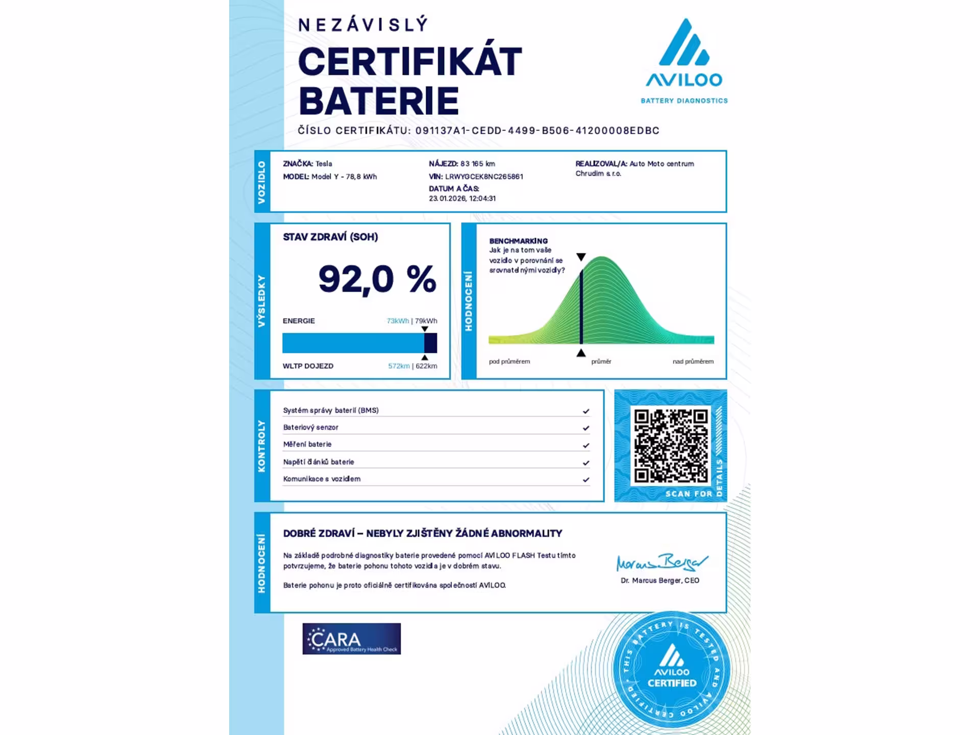 Tesla Model Y Long Range 378 kW SOH 92% FSD (ODPOČET DPH) - cena uvedena vč. DPH, baterie 78,8 kWh, dovoz: Německo, VIN: LRWYGCEK8NC265861, elektro, do provozu: 11.3.2022, najeto: 83165 km, pohon kol: 4x4, automatická převodovka, STK do: 8/2027, WLTP 560 km, procesor AMD RYZEN, klimatizace, parkovací kamera, přední a zadní vyhřívaná sedadla, vyhřívaný volant, MATRIX SVĚTLOMETY, FSD - autopilot, BOOM BOX. Záruka na Akumulátor a hnací ústrojí 8 let nebo po ujetí 192.000 km (podle toho, co nastane dříve).*MOŽNOST VYKOUPENÍ VAŠEHO STARÉHO VOZU PROTIÚČTEM* *MOŽNOST VÝHODNÉHO FINANCOVÁNÍ už bez nulové akontace* Pro nezávaznou kalkulaci nás neváhejte kontaktovat. Nutno vždy volat předem! Prohlídky možné i mimo pracovní dobu tel. 732710796 Mates auto. Nejedná se o návrh na uzavření smlouvy (nabídku) dle § 1731 zákona č. 89/2012 Sb., občanský zákoník, ale o nezávaznou nabídku.